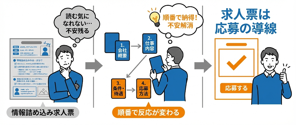 候補者は、求人票を上から順に丁寧に読みません。自分に関係ある箇所を先に探し、「ここなら話を聞いてもいいか」を短時間で判断します。