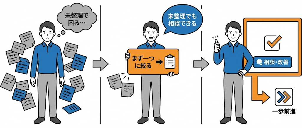 注意点として、「全部整理してから相談しよう」と考える必要はありません。むしろ未整理の段階の方が、課題の本質が見えやすいことがあります。
